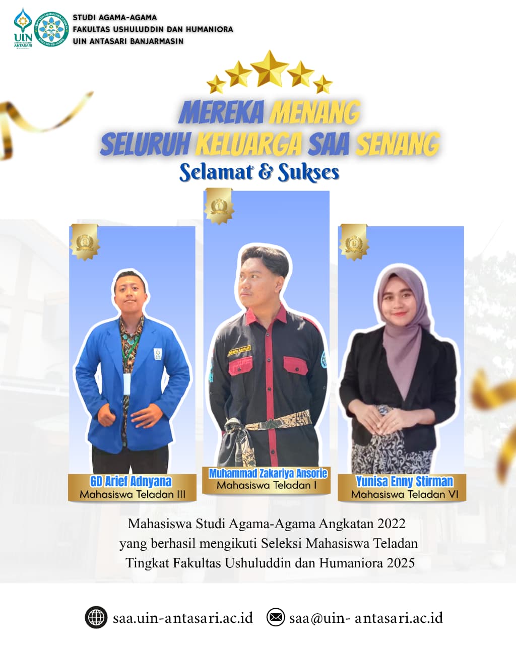 Banjarmasin – Fakultas Ushuluddin dan Humaniora (FUH) UIN Antasari Banjarmasin kembali mencetak bibit unggul. Tiga mahasiswa dari Program Studi Agama Agama (SAA) Angkatan 2022 berhasil menorehkan prestasi membanggakan dalam Seleksi Mahasiswa Teladan Tingkat Fakultas. Pengumuman ini menunjukkan dominasi dan kualitas …